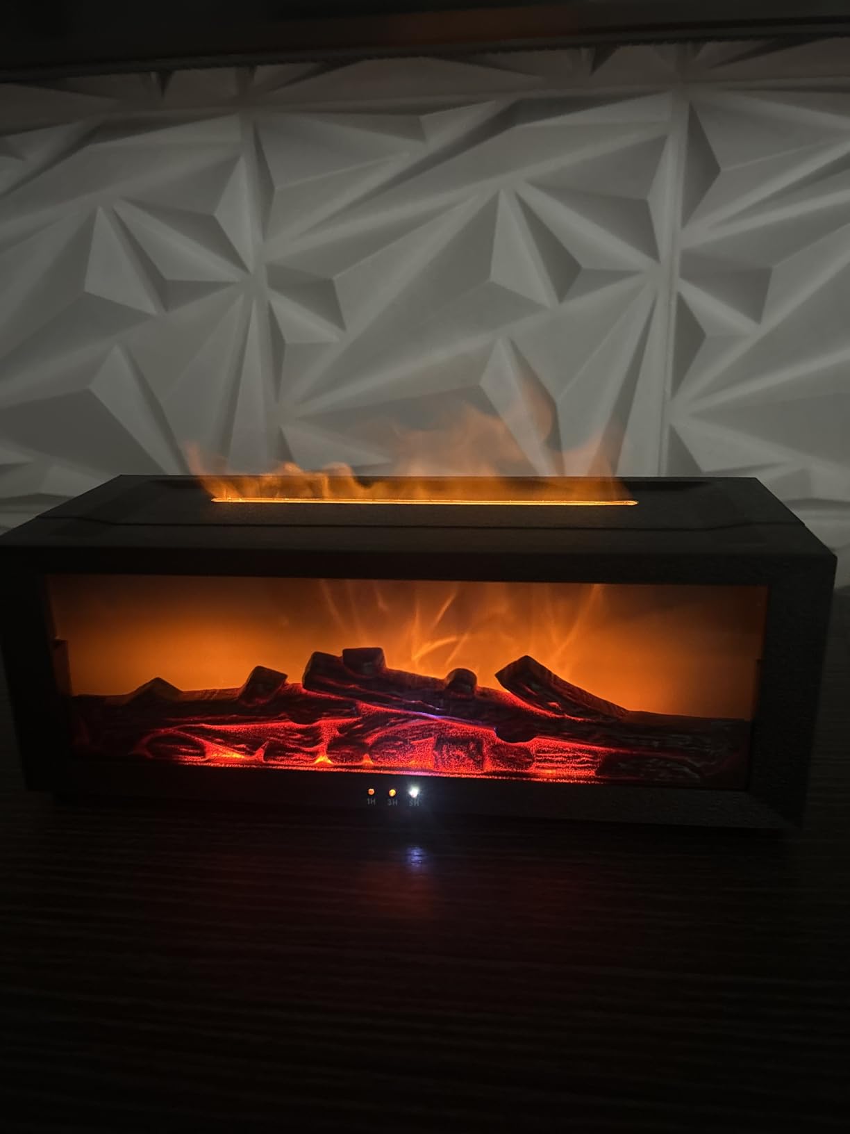 Flame Effect Fireplace Aroma Diffuser – A low-noise essential oil diffuser with realistic flame and fireplace effects, designed to create a cozy atmosphere while filling the room with soothing fragrances.